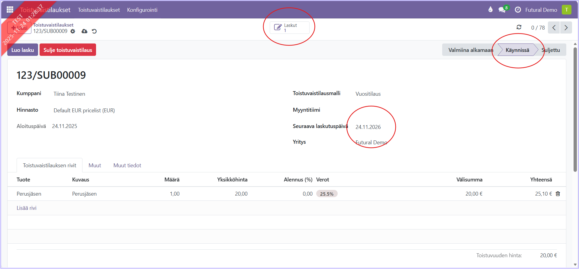 Kun tiedot ovat oikein, voit käynnistää tilauksen painamalla oikeassa yläkulmassa tilauksen tyypiksi Käynnissä. Jos haluat, että järjestelmä luo asiakkaalle ensimmäinen laskun haluamanasi päivänä, valitse seuraava laskutuspäivä tilauksen kortilla (kts alla olevasta kuvasta).