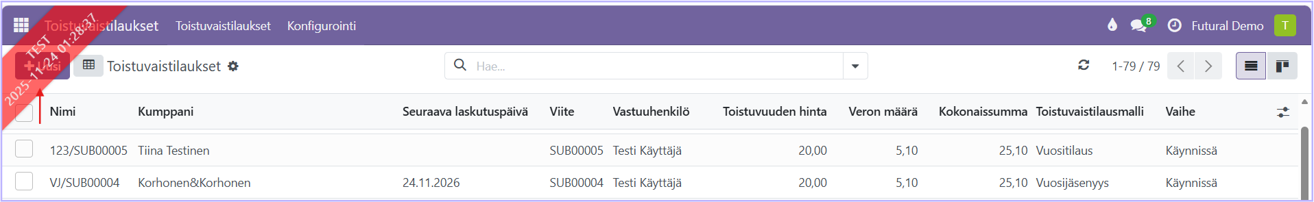 Asiakkaalle voidaan luoda tilaus, jonka perusteella järjestelmä luo asiakkaalle säännöllisin väliajoin laskun. Toiminto löytyy moduulista Toistuvaistilaukset, jossa näet kaikki käynnissä olevat toistuvaistilaukset.