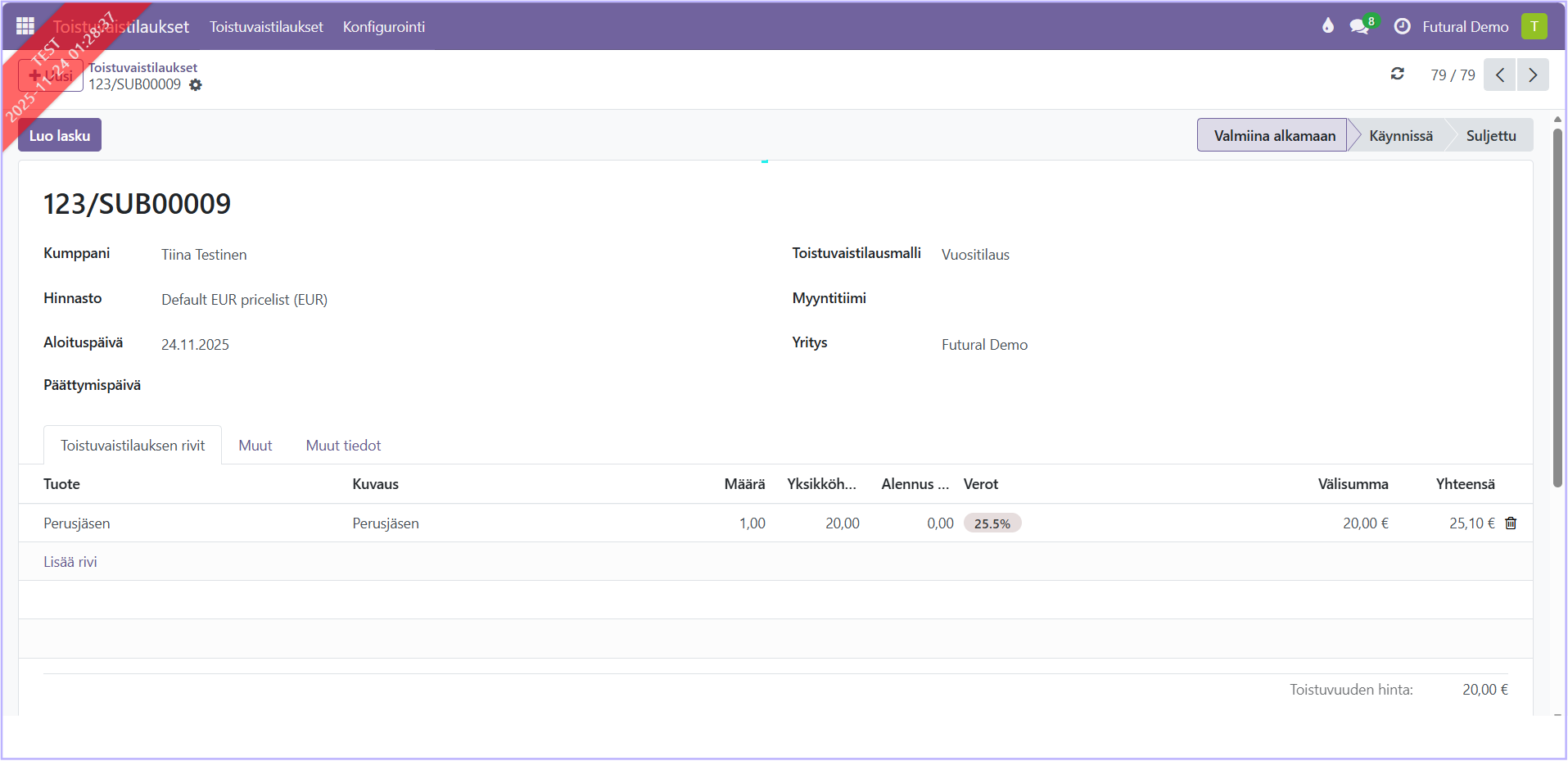 Jos haluat lähettää ensimmäinen laskun välittömästi, valitse Luo lasku, jolloin järjestelmä avaa esiin laskuluonnoksen. Tarkasta tiedot, Vahvista ja lähetä lasku. Valitse tämän jälkeen tilauksen kortilla seuraava laskutuspäivä. Tästä eteenpäin lasku muodostuu automaattisesti.