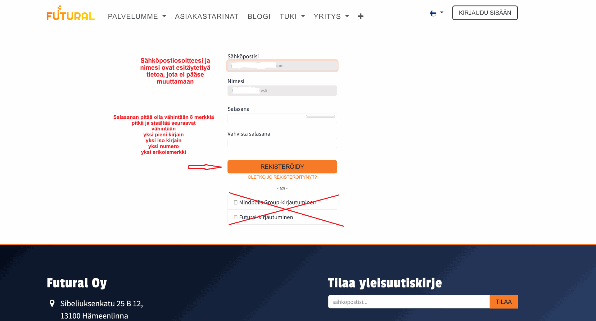 Anna salasanasi ja vahvista se antamalla se uudestaan, paina tämän jälkeen "Rekisteröidy"