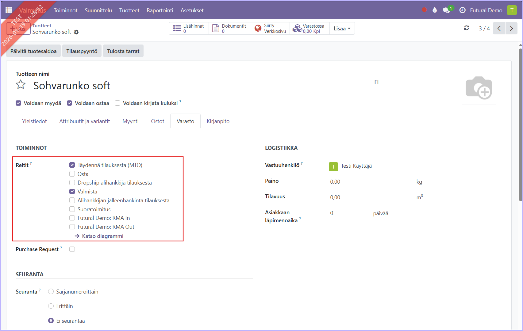 - Kun tuotepaketti merkitään myydyksi, varaston toimitustilaukselle merkitään siihen kuuluvat tuotteet (sukka 3 kpl) ja myyntitilauksella näkyy tuotesetti (sukkapaketti 1 kpl).