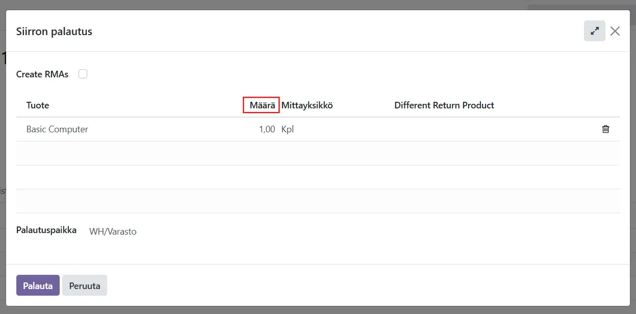 - Paluusijaintiin merkitään varasto, johon tuotteet palautuvat