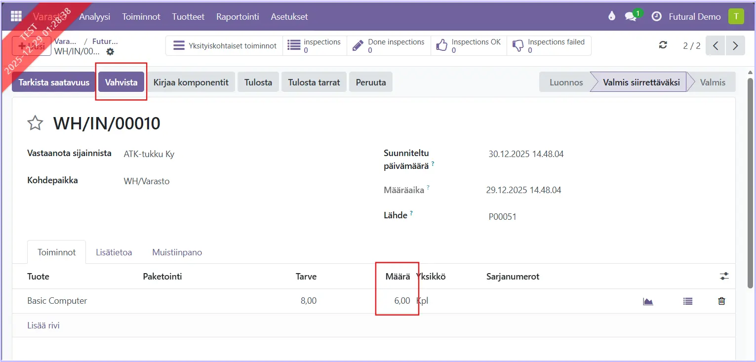 Jos kaikki tavarat ovat saapuneet tilauksen mukaisesti, paina nappia Vahvista / Validate. Siirtodokumentti vaihtuu tilaan Valmis ja tavarat siirtyvät varastosaldolle.