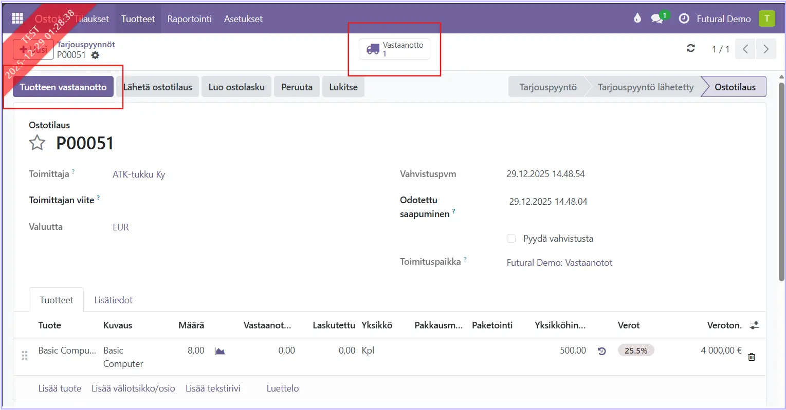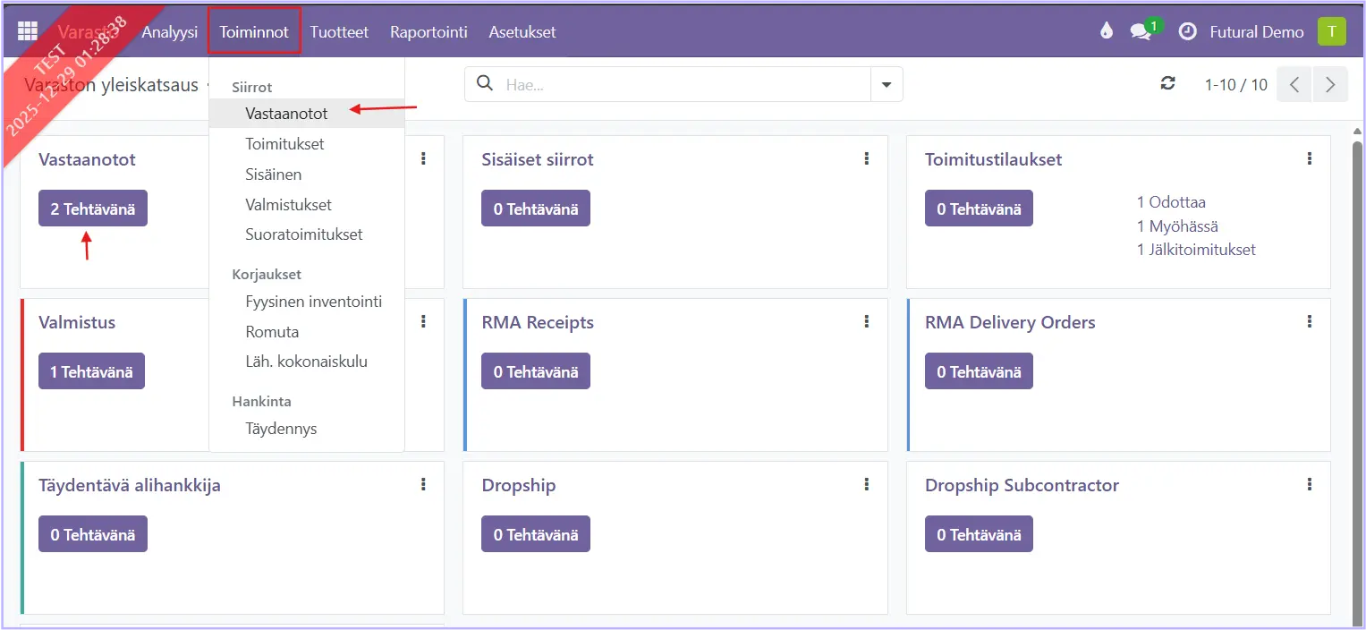 Pääset kuittaamaan ostotilauksen tai muiden tuotteiden vastaanoton varastoon useampaa reittiä käyttäen: