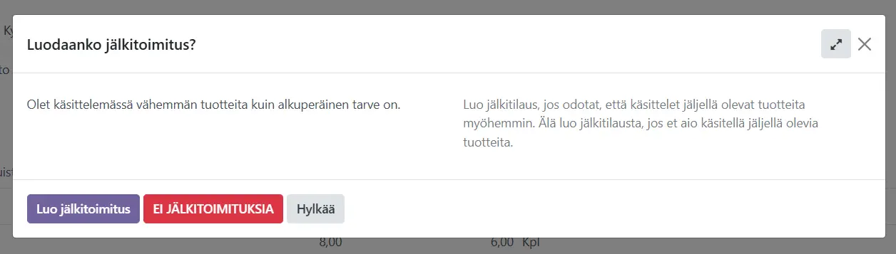 - Jos painat nappia Luo jälkitoimitus / Create Backorder