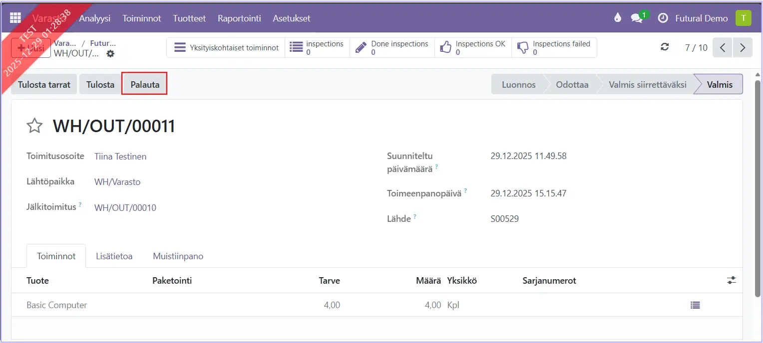 Mikäli jo toimitetuksi merkattuja tuotteita palautuu varastoon, täytyy niistä luoda vastaanotto. Tämä voidaan tehdä menemällä toimitustilaukselle ja valitsemalla vasemmalta ylhäältä Palauta / Return.