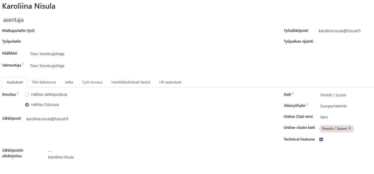 Voit ottaa Odoo-käyttäjän, joka ei seuraa korttia, mukaan viestiketjuun käyttämällä @-merkkiä: Kirjoita viestiin @ ja alkua käyttäjän nimestä, jolloin järjestelmä ehdottaa mahdollisia vaihtoehtoja. Valitse oikea henkilö listasta. Nimi näkyy sinisenä, kun viesti on mennyt käyttäjälle perille.