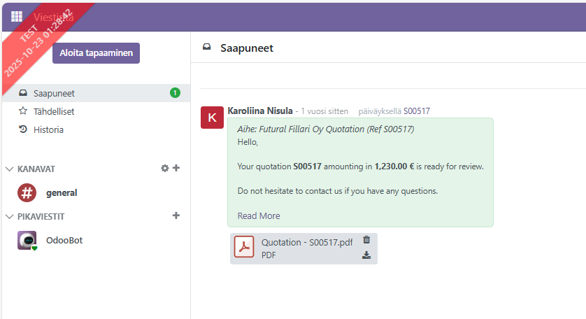 Viestit, kanavat ja suorat keskustelut ovat saatavilla myös muista moduuleista – esimerkiksi myyntitilauksesta, projektista, CRM-kanavasta.Viestejä syntyy sekä järjestelmästä että muilta käyttäjiltä.